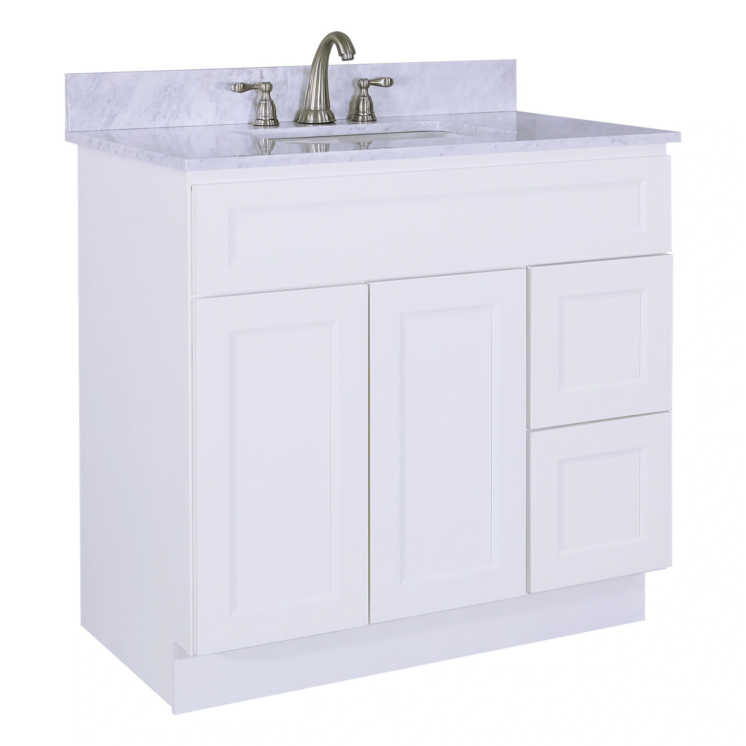Vanity to the left is an example of a 36" vanity with a countertop, backsplash, sink and faucet attached. Please note, countertop, backsplash, sink and faucet are not included with our Blair Shaker RTA built-in style vanity.